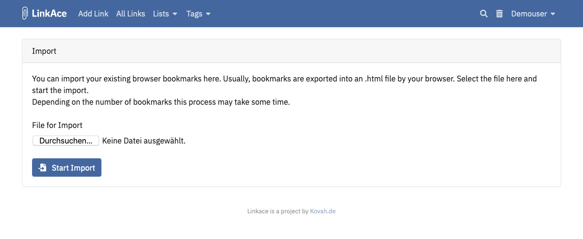 After choosing your import file, LinkAce will go through all bookmarks and save them as links. Please be patient! This process may take a long time, depending on the number of bookmarks to import. LinkAce tries to generate metadata for all new links, which requires accessing the website itself.
